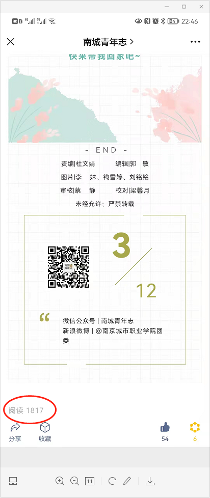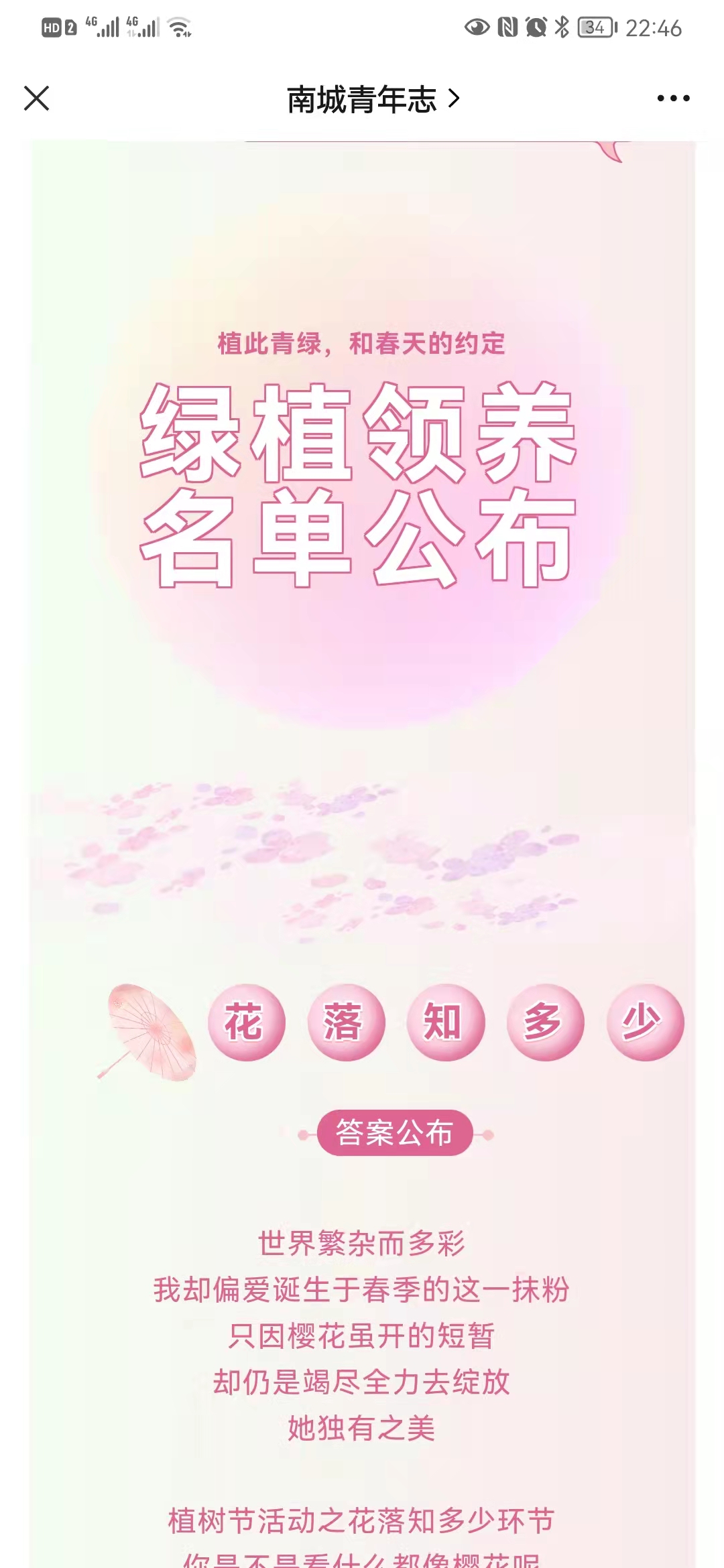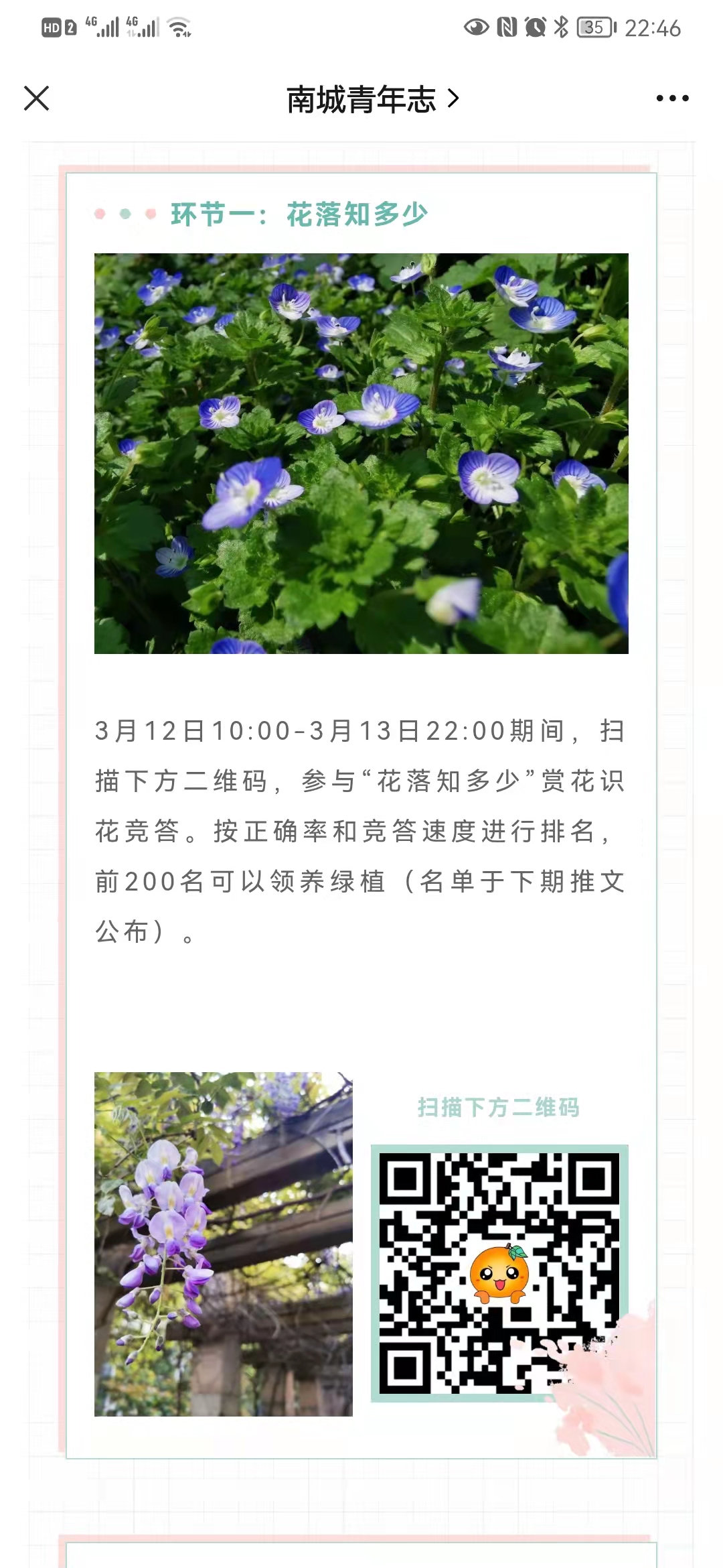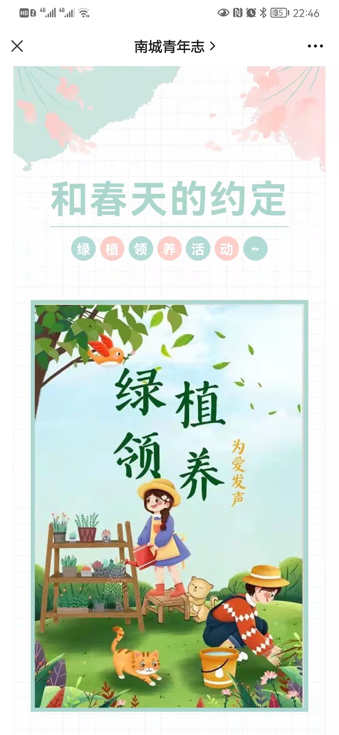 312日植树节当天,校团委通过“南城青年志”微信公众号向全校师生发起绿植领养的邀约。本次活动设计“花落知多少”“给我点个赞”“来带我回家”“与我共成长”“春天再续约”等五个环节,包含看图识花、转发微信朋友圈集赞宣传、领养绿植、分享养护经验、领养者于下一个植树节报名参加绿植养护大赛等活动,通过线上线下紧密结合互动的形式,吸引广大师生参与,积极引导广大青年树立生态文明观念,倡导践行更加高效便捷的绿色生活方式。本次活动微信累计阅读量超1800次,参与竞答环节人数达517人,领养绿植200盆。