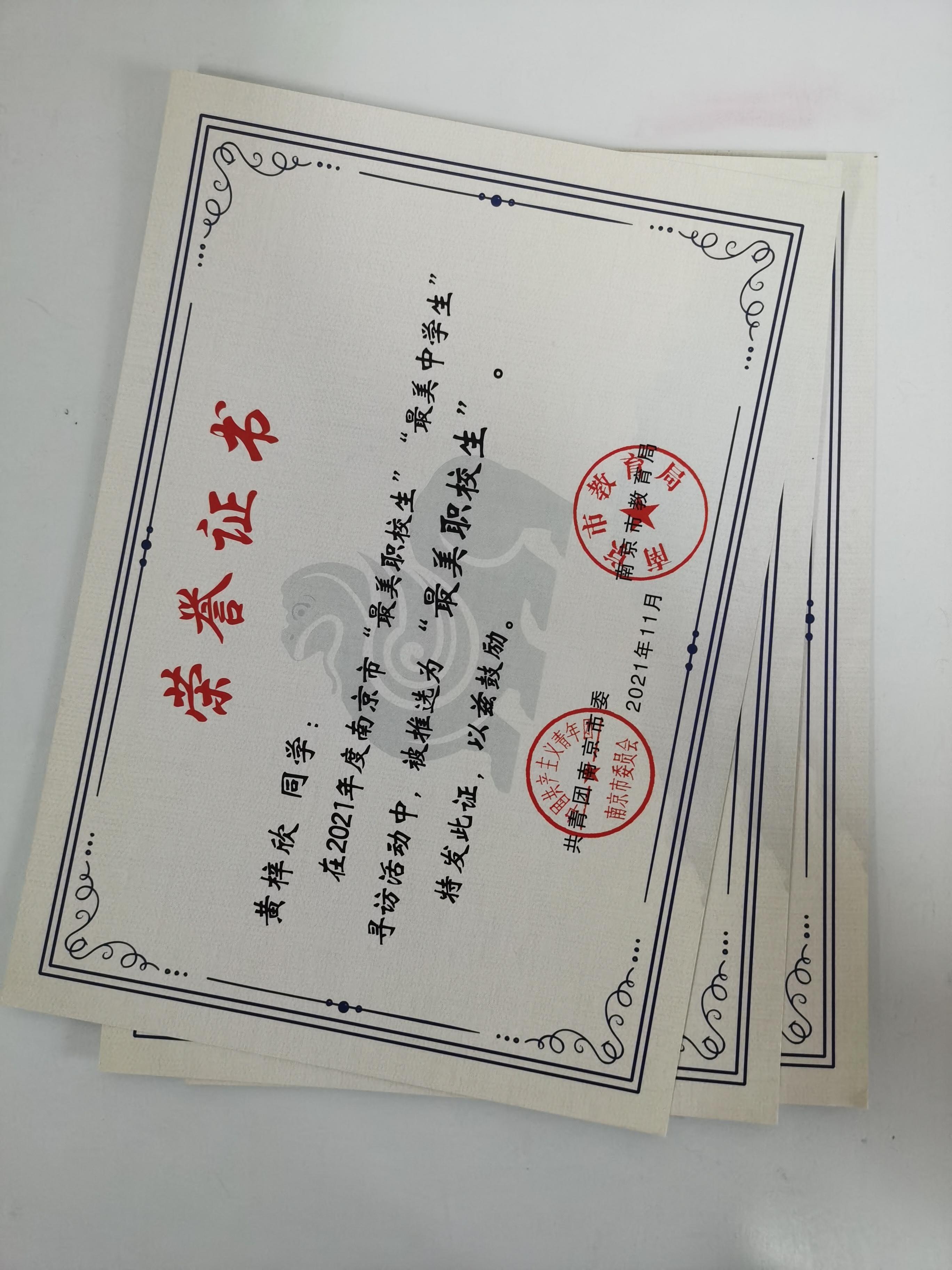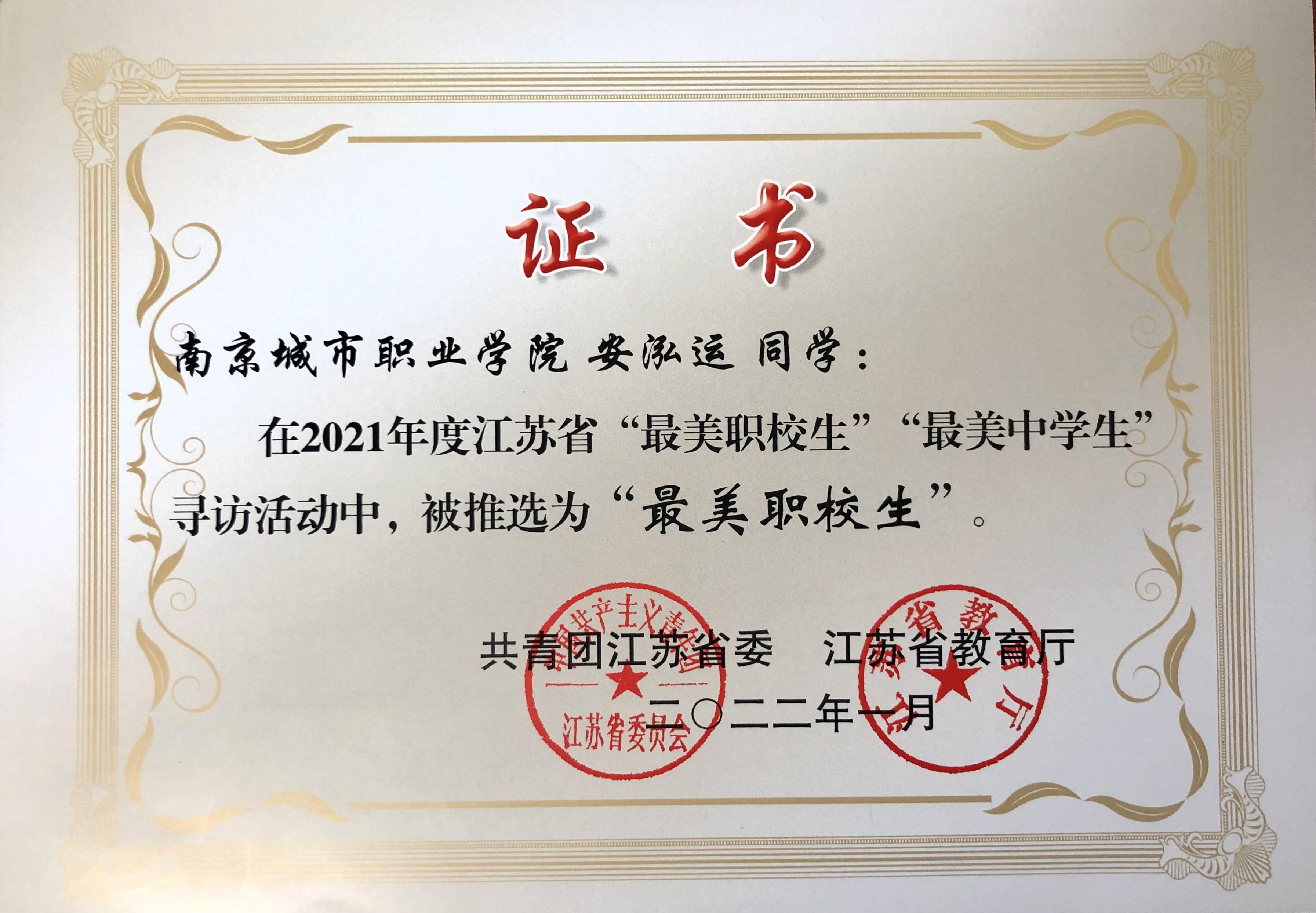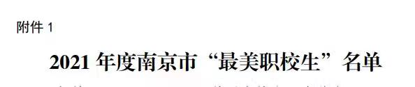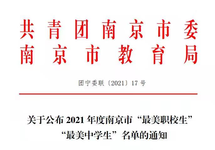 近期,2021年度江苏省“最美职校生”“最美中学生”寻访活动和南京市“最美职校生”“最美中学生”寻访活动结果出炉。我校安泓运、黄梓欣、梁月、刘宝、刘世杰、童嘉雯、徐薇、杨姗姗、叶伟、殷佳婕荣获南京市“最美职校生”称号。其中,安泓运荣获江苏省“最美职校生”称号。