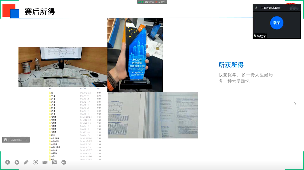 本次故事会五位同学各自分享了他们参赛经历和心路历程。参加建筑信息建模与应用赛项的19级建筑工程技术专业高载荣同学提到大学是一个多方位锻炼自身的地方,时不我待,要利用一切机会学习知识、锻炼技能、磨练耐心、丰富经历。参加餐厅服务赛项的20级营养配餐专业刘泓诗分享了从“技能小白”到“中餐服务达人”的经历,备赛过程虽然艰辛,但是通过不断练习,达到最好的效果,非常欣慰。刘泓诗搭档申紫如同学认为最大的收获是看到了自己的无限可能,要相信自己,多学技能,开拓视野,勇往直前。参加导游服务赛项的20级旅游管理专业的王聪分享了如何突破自我的经历。兴趣是人生的第一导师,光有兴趣还不够,还要通过千百次的磨练才能突破自己、化茧成蝶。本次故事会特邀17级工程造价专业,现就读于南京工业大学的杨婧莹分享她的故事。她曾参加了广联达BIM应用技能比赛造价组大赛、华东区CAD应用技能比赛、江苏省高等职业院校技能大赛建筑识图赛项,取得了优异的成绩,她提醒同学们要为自己的未来找到目标,学习自己的领域里的各种知识,深入钻研,熟悉并应用到以后的学习中。