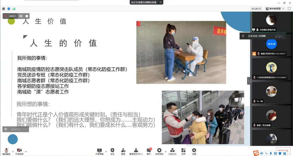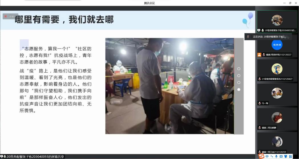 分享会上,一个个感人故事层出不穷,被娓娓道来:21级志愿者唐慊同学任劳任怨,多次参加学院核酸检测的志愿者团队,哪里有需要哪里就有她的身影,她引用鲁迅先生名言说道“愿中国青年都能摆脱冷气,只是向上走,不必听自暴自弃者之流的话,能做事的做事,能发声的发声,有一分热,发一分光,就令萤火一般,也可以在黑暗里发一点光,不必等候炬火。每一个志愿者都是南城最美的风景”;20级志愿者张文静在暑假期间,积极参与社区的志愿服务,耐心细致地做好每一次检查,她的脸盘晒脱皮了,她的嗓子沙哑了,她的衣服被汗水湿透了,但是她还是默默坚守自己的岗位,仔细核验小区门口每一个进出人员的苏康码、行程码,遇到年纪大不会使用手机的老人,还一遍遍不厌其烦地帮助他们领取新码。学院党员老师践行习近平总书记的嘱托,守土有责、守土尽责,化身志愿服务秩序引导员、物资运输员、核酸检测协助员,在各个方面发挥着先锋模范作用。孙国卿老师说“作为一名党员老师,抗击疫情是责任和使命,只要学生有需要,我必须上,我要冲在最前面”。一句句朴实的话语、一个个感人的故事,我们的师生在自己平凡的岗位上用自己的青春与汗水叙写了不平凡的感人的事迹。