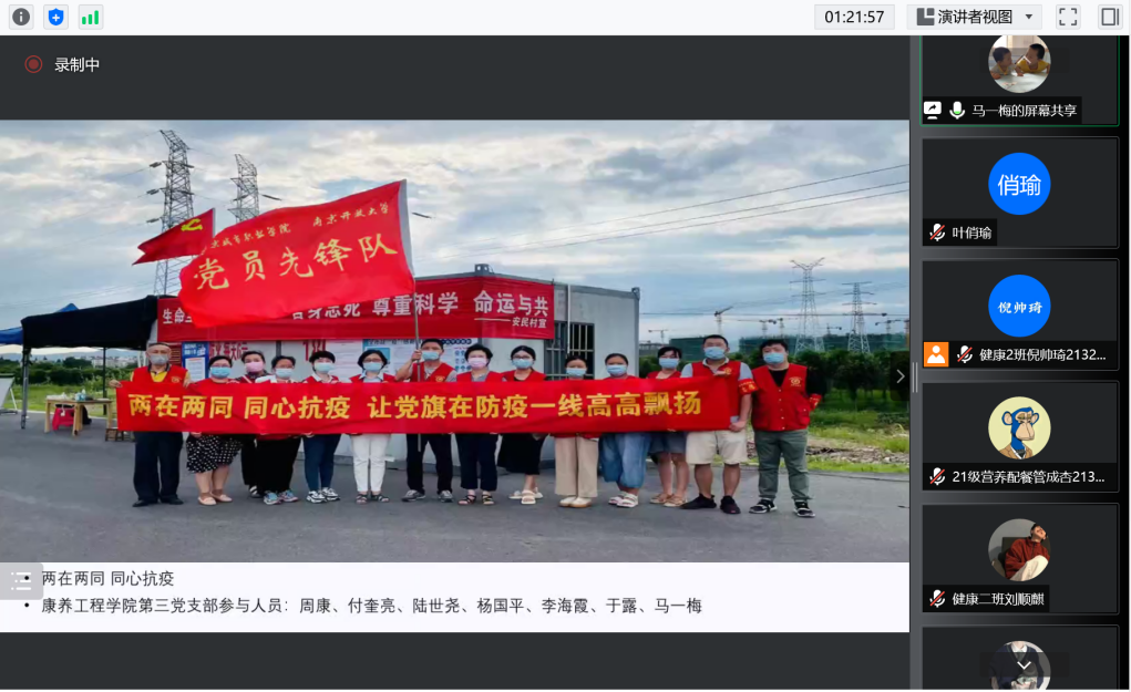 为充分展现我院师生抗疫风采,激励学生发挥先锋模范作用,宣扬伟大的抗疫精神,514日晚上19:00-20:00,康养工程学院结合职教周相关活动,举办了“众志成城有我”线上抗疫故事分享会。学院党员代表马一梅老师、孙国卿老师,19级学生窦颖,20级学生解旭平、张文静、张子栋,21级学生唐谦、胡多为同学们带来了他们精彩的抗疫故事,全院近300名同学通过腾讯会议参加了此次故事分享会。