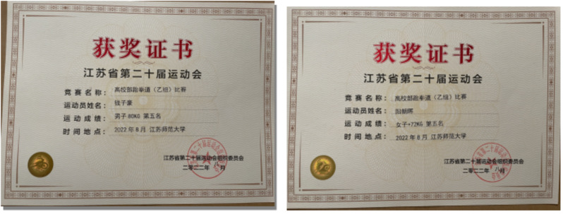 江苏省第二十届运动会高校部跆拳道(乙组)比赛于8月3日至8月7日在江苏师范大学举行,全省28所高职院校参赛。我校代表队由公共教学部副主任巴佳慧、支部副书记孙宇担任领队,体育教研室党员教师吴宾、张之海老师担任教练员,率领5名运动员出征。数字财商学院阳朝晖同学和康养工程学院钱子豪同学力克强敌,均取得第五名的历史最好成绩。