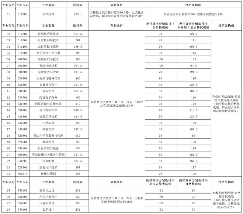 我校2023年高职提前招生录取工作已结束,各专业录取投档线如下表: