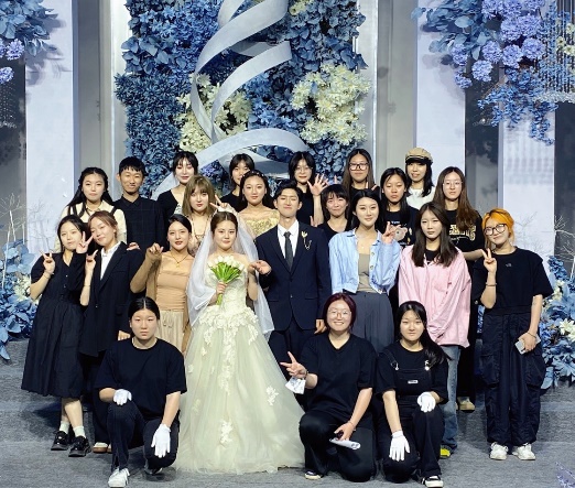 2021级婚庆班同学在本学期学习专业课程《婚礼策划》伊始就把自己当成一名未来的婚礼策划师,对照婚礼策划岗位工作流程标准,从校外兼职教师提供的真实婚礼策划案例中选取一个作为背景信息,去收集新人爱情故事,寻找创意思路,提取设计元素,设计婚礼主题,收集和选取婚礼宴会背景,设计仪式流程,并制成PPT在课堂中模拟婚礼提案,然后去喜悦山婚礼堂现场彩排,最后根据婚礼堂空间布景设计来调整策划方案,直至此次主题婚礼秀的成功演出。