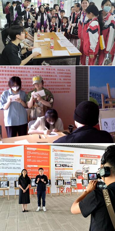 517日下午,正值我校在溧水校区举办中小学职业体验开放活动,在科创楼一楼举办的Q版人物肖像绘制活动现场火速吸引了众多前来体验的中小学生。同学们在此次活动中为前来体验的小观众们快速创作与绘制了一些Q版肖像漫画,引发了小朋友们的热烈反响。在用自己的创作给观众们带来了参与感、互动感与快乐的同时,同学们也从中锻炼与提升到了自己的相关设计技能,如绘画技术的提升、人物肖像特征的抓取、绘画速度的把握、与观众交流沟通的能力等。518日下午,肖像绘制活动转场到明德长廊举行,同样吸引了诸多师生前来体验,一些同学在被画的同时也尝试去进行了一些简单的绘画创作体验,观众们也在此次互动中了解到一些和肖像漫画相关的知识。此次活动还吸引了南京市和溧水当地媒体前来采访报道。