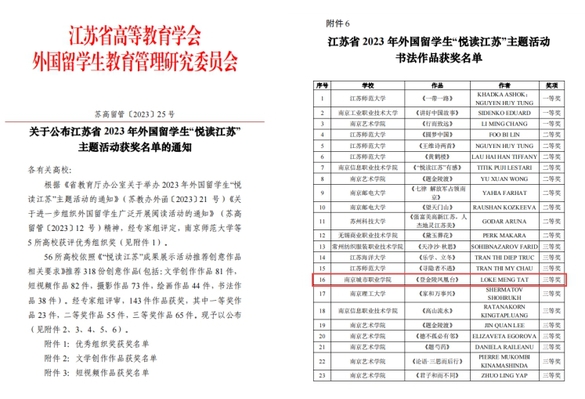 近日,由省教育厅主办的江苏省2023年外国留学生“悦读江苏”主题活动圆满落幕。我校留学生表现优异,获得书法作品三等奖荣誉。