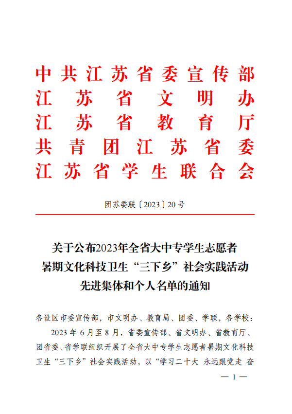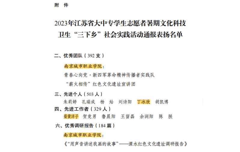 近日,我校收到中共江苏省委宣传部、江苏省文明办、江苏省教育厅、共青团江苏省委、江苏省学生联合会对组织开展的全省大中专学生志愿者暑期文化科技卫生“三下乡”社会实践活动表彰文件,“青春心向党·新四军革命精神传播者实践队”、“‘薪火相传’红色文化遗址宣讲团”荣获“优秀团队”,“‘用声音讲述我画的故事’——溧水红色文化遗址调研报告”荣获“优秀调研报告”,数字文创学院丁冰欣同学获“先进个人”荣誉称号,校团委副书记、康养工程学院柴黄洋子老师获“先进工作者”荣誉称号。