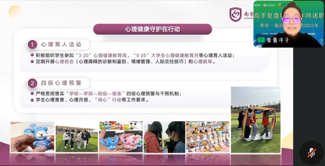 在1月22日举办的学生工作年度交流研讨会上,千余所高职院校学生工作部门的负责同志及辅导员老师参会,21所高职院校辅导员老师做专题发言。我校康养工程学院辅导员柴黄洋子老师围绕“以青春之志•担育人使命”主题,从强化学生思想教育、优化学生心理素质、培育良好行为习惯、完善资助工作质量、提升综合素质能力等五个方面回顾总结了作为辅导员的2023年重点及特色工作,得到了兄弟院校领导和老师的充分肯定和赞扬。