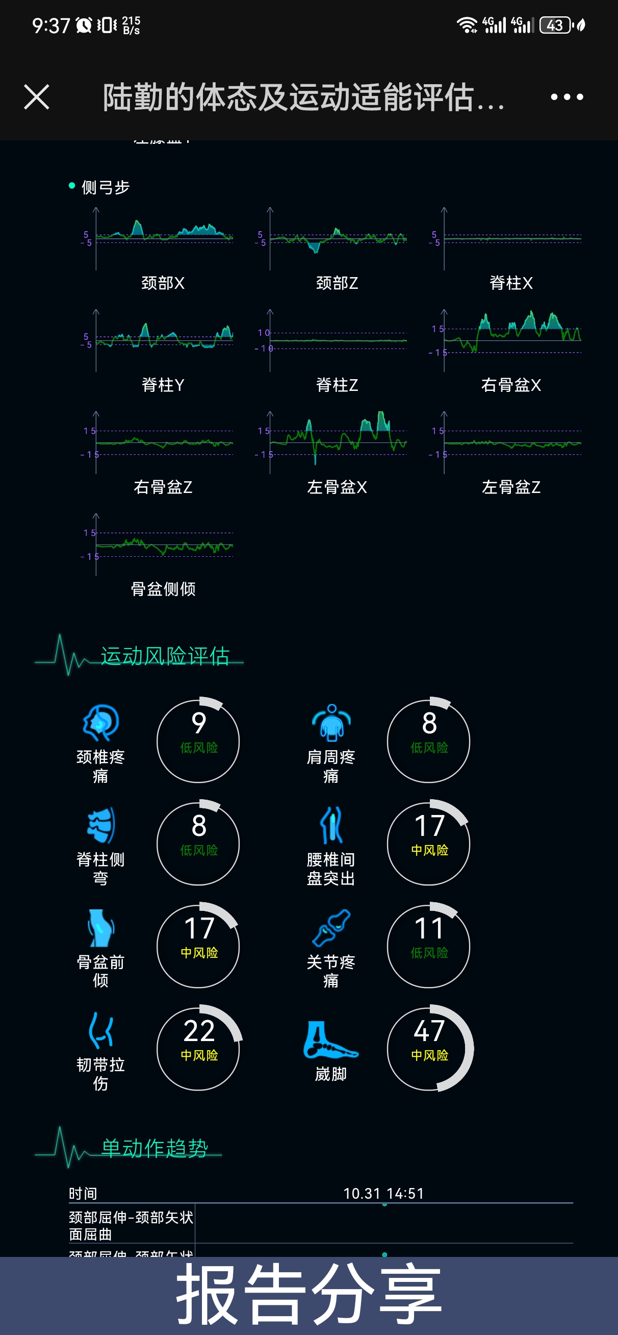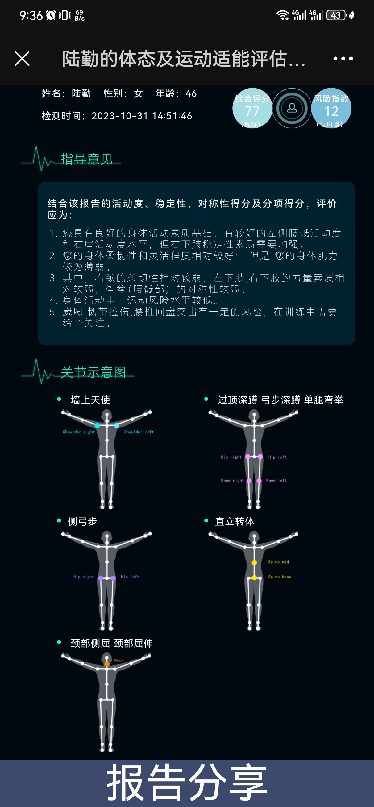 师生们对这台“镜”表现出浓厚兴趣,体验的队伍排起了长龙,每个人都跃跃欲试。体验者按照示范做起了各种动作,“魔镜”采用先进视觉识别技术,对人体运动进行全面捕捉,分析关节活动度、动作稳定性及对称性等指标,让体验者直观了解到自身在运动中的潜在风险点。“魔镜”还针对主要身体部位的运动损伤风险进行了量化评估与预测,为师生提供了个性化“运动处方”,实现了从评估到干预的闭环健康管理服务。