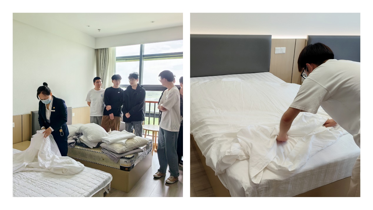 为了让学生有更加深刻地感受,59日,学院还邀请了南京珍珠voco酒店客房部经理走进课堂、为学生进行操作示范与讲解,和学生们一起参与到客房服务操作与管理工作中,通过真实的实践操作提高自己的实际能力。