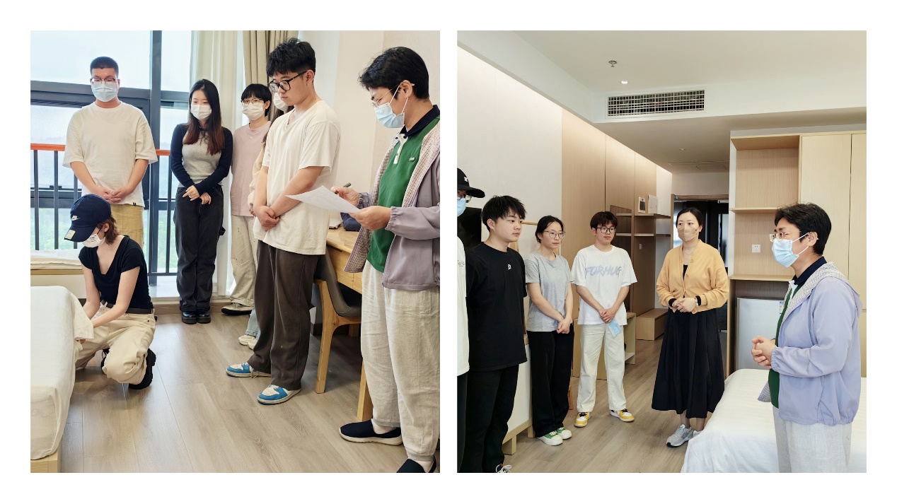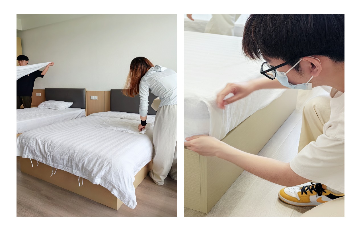 《民宿前台与客房服务》是民宿管理与运营专业的核心课。客房服务包括了客房部的基本知识、操作流程以及服务技巧等方面的内容。为了提高学生们客房实操技能,在后勤处、装信处的支持下,老师带领学生在科创园8楼的标准间进行为期8周的实训操练。具体内容包括甩床单定位、套被套和枕头、铺床包45度角以及擦拭浮灰、打扫卫生间等工作任务。