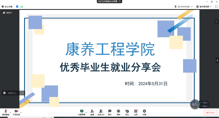 高山仰止,景行行止。自古以来,榜样就是引领我们前进的明灯。为深入贯彻党的二十大精神,落实党中央、国务院关于“稳就业”“保就业”的决策部署,进一步激发广大学子的就业热情,提升就业能力,5月31日晚19:00康养工程学院举办优秀毕业生就业分享会,本次分享会邀请了我院黄立勇、殷佳婕、孙青青等优秀毕业生代表分享他们的就业经验。