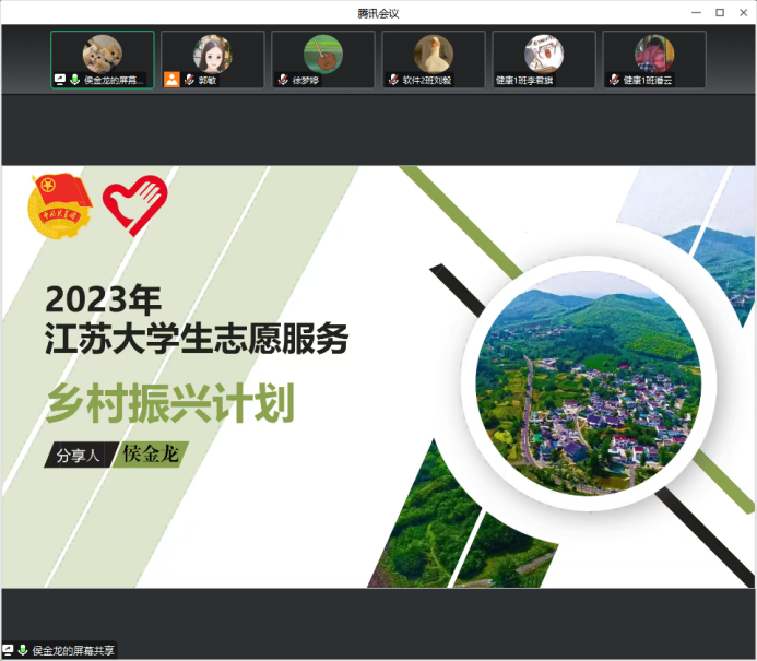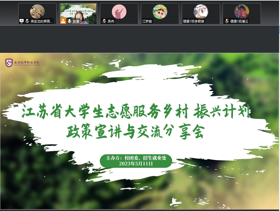 为更好地推进“大学生志愿服务乡村振兴计划”志愿者招募工作,引导和鼓励我校学子为江苏发展贡献青春力量,511日晚,校团委通过腾讯会议平台举办了江苏省大学生志愿服务乡村振兴计划政策宣讲和交流分享会。此次分享会邀请了志愿服务乡村振兴计划南京市项目办志愿者侯金龙和我校2018年苏北计划志愿者吴冉为同学们进行了宣讲与交流分享。此次分享会由校团委郭敏老师主持。此次活动吸引了全校100名同学参与。