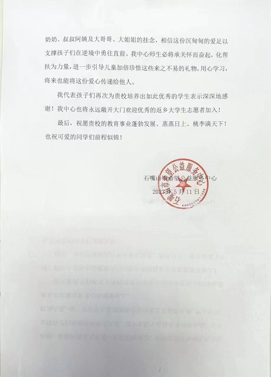 近日,我校收到石嘴山市希望公益服务中心发来的感谢信,对我校师生向宁夏回族自治区石嘴山市希望公益服务中心及石嘴山市大武口区星海镇东湖社区儿童的物品捐赠表示感谢,对我校康养工程学院白溶溶同学于“返家乡”社会实践期间所做的志愿服务工作予以表扬!对我校培养出优秀的学生表示感谢!