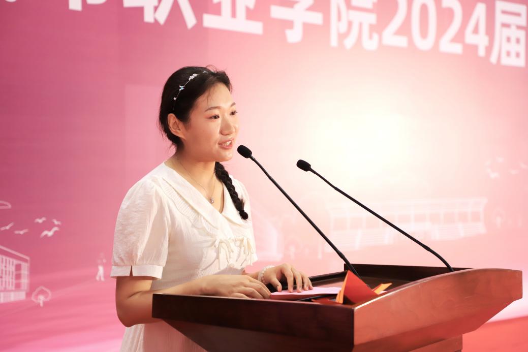 毕业生代表、康养工程学院白溶溶同学表达了对母校的感谢,并表示会将老师、学长们的叮咛和祝福转化为砥砺前行的动力和勇气,在不懈的奋斗中实现人生价值,为母校增光。