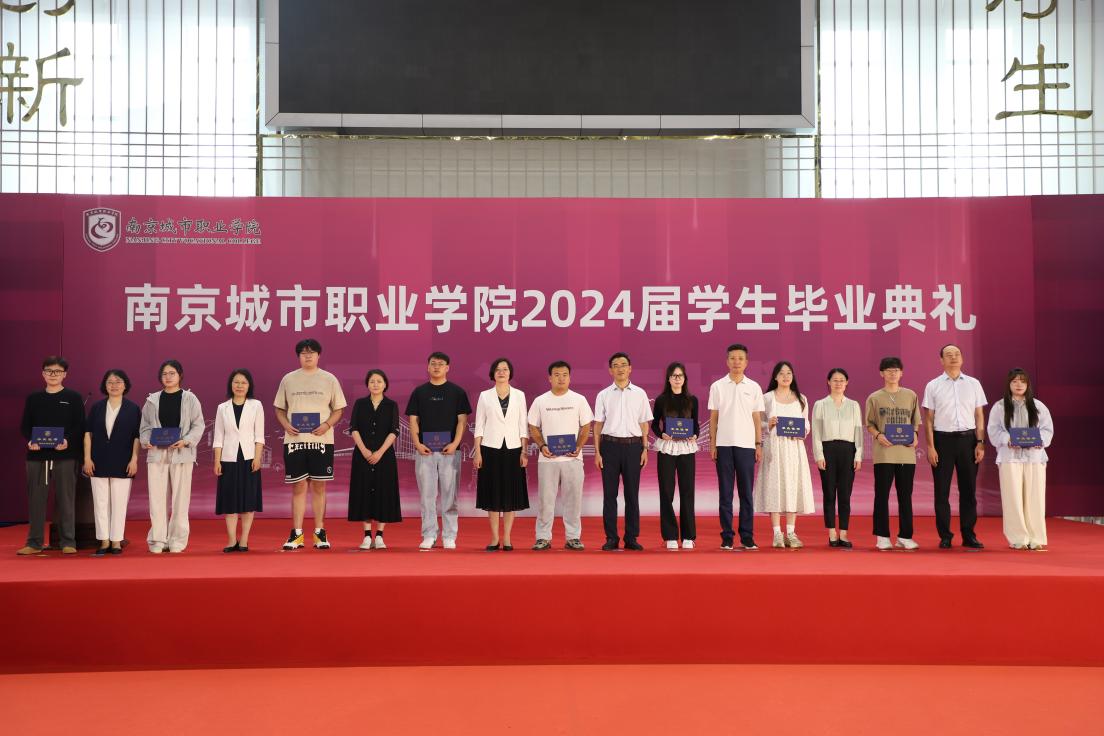 毕业证书颁发仪式上,校领导为毕业生代表颁发毕业证书并合影留念。