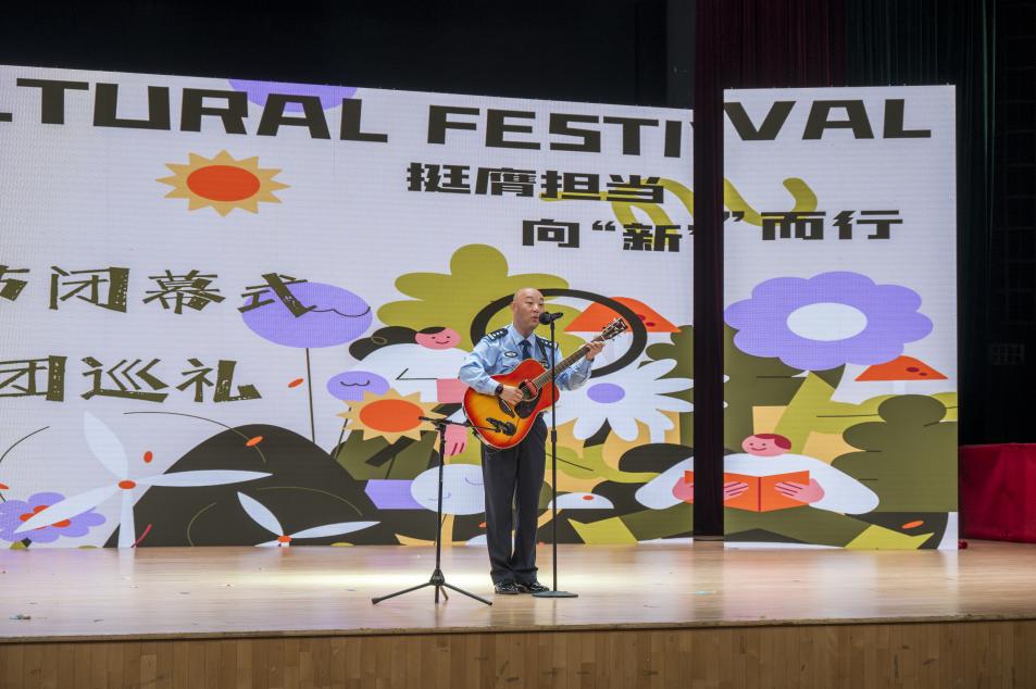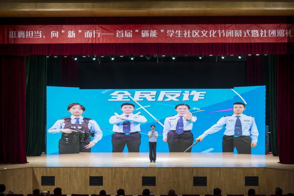 随后,以“敬过往、爱当下、向未来”三个篇章构成的文艺汇演,为本届学生社区文化节画上了圆满的句号。闭幕式现场,校党委副书记史献平对“砺能”学生社区文化节的logo征集获奖者进行颁奖。在节目互动环节,溧水区公安分局的反诈小分队带来了反诈宣传节目《阳光男孩女孩》,南京市禁毒支队的陈林警官登台献唱《禁毒志愿者之歌》,这两大主题教育的融入,使得本次闭幕式不仅是一场艺术的盛会,更是一次深刻的思想教育。学生们在欣赏精彩节目的同时,也深刻认识到了反诈和禁毒的重要性,增强了自我保护意识和社会责任