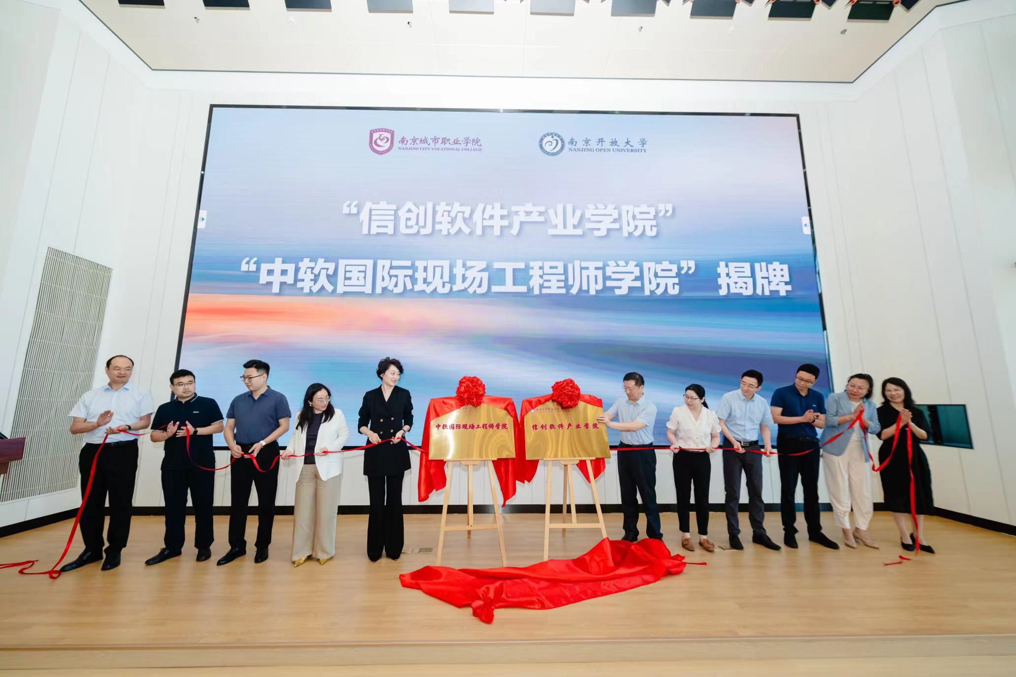 随后举行“信创软件产业学院”“中软国际现场工程师学院”揭牌仪式。南京市委机要保密局葛慧莉副局长,南京市教育局一级调研员、职社处处长黄子亮,我校党委委员、副校长江景,党委委员、智能工程学院院长力志等多位领导共同揭牌。