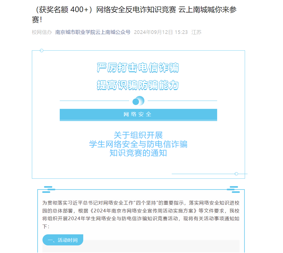 宣传周期间,我校师生积极参加教育部网络安全宣传周校园日重点活动及省、市级网信部门举办的网络安全相关活动。同时,我校积极组织师生校内宣传活动,如学生网络安全与防电信诈骗知识竞赛、学生网络安全宣传海报征集活动、教职工网络安全及信息化素养提升专题线上培训,以赛促学,增强师生的网络安全意识。