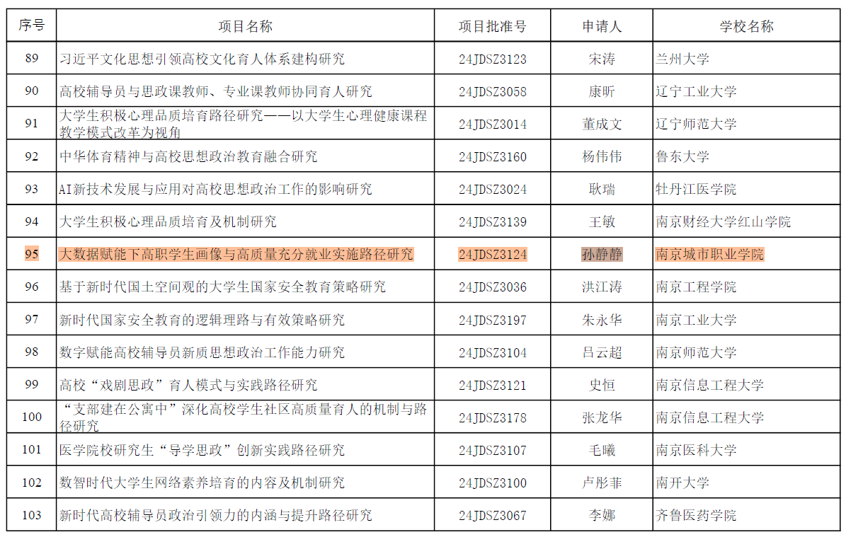 近日,教育部社科司公布了2024年度教育部人文社会科学研究一般项目立项结果,我校数字财商学院辅导员孙静静老师牵头申报的“大数据赋能下高职学生画像与高质量充分就业实施路径研究”获批2024年度教育部人文社会科学研究专项任务项目(高校辅导员研究)立项。