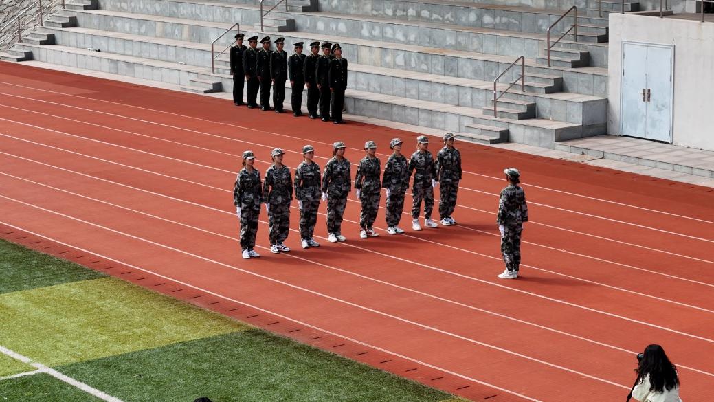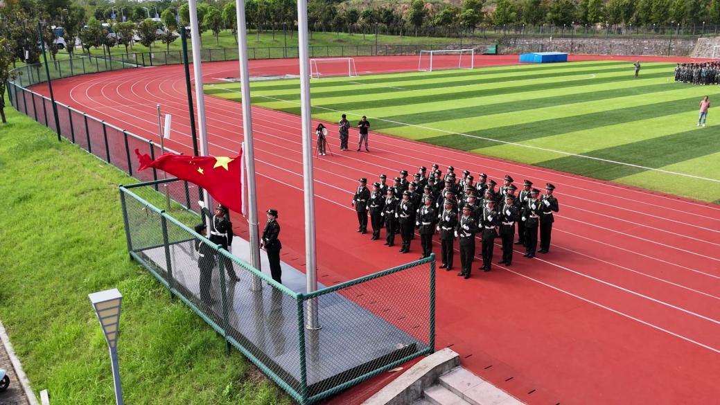 国旗护卫队英姿飒爽、步履铿锵,护送国旗入场。庄严雄壮的国歌声中,鲜艳的五星红旗冉冉升起,全场肃穆,以青春之名、军人之姿开启2024级学生军训闭营仪式。