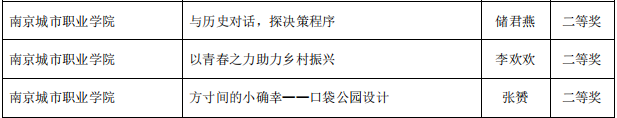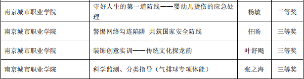 数字文创学院储君燕老师作品《与历史对话,探决策程序》、思政教学部李欢欢老师作品《以青春之力助力乡村振兴》与数字文创学院张赟老师作品《方寸间的小确幸——口袋公园设计》喜获二等奖,康养工程学院杨敏老师作品《守好人生的第一道防线——婴幼儿烫伤的应急处理》、公共教学部任旸老师作品《警惕网络勾连陷阱 共筑国家安全防线》、数字文创学院叶舒飏老师作品《装饰创意实训——传统文化探龙韵》和公共教学部张之海老师作品《科学监测、分类指导(气排球专项体能)》获得三等奖。