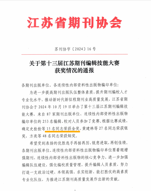 全省期刊编辑技能大赛是江苏省期刊协会为进一步提高期刊出版队伍整体素质、提升期刊编校人才专业化水平、推动新时代新征程期刊业高质量发展而举办的年度赛事。2024年10月19日在南京举办的第十三届江苏期刊编辑技能大赛,共有来自87家期刊出版单位、连续性内部资料性出版物编印单位的253名编辑、校对人员参加竞赛,评出金奖15名、银奖27名、铜奖48名。我校学报编辑部薛健老师凭借出色的业务水平与专业素养,获得本次大赛金奖,在253名参赛选手中排名第6位。
