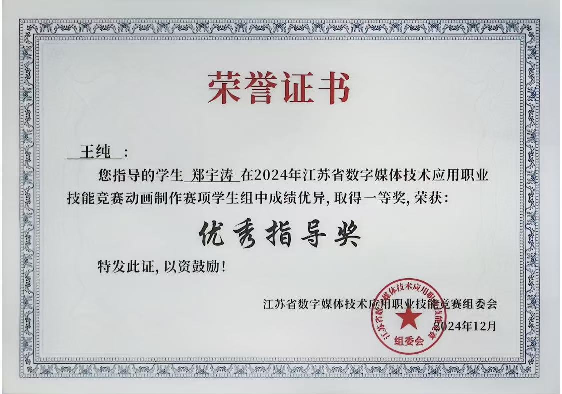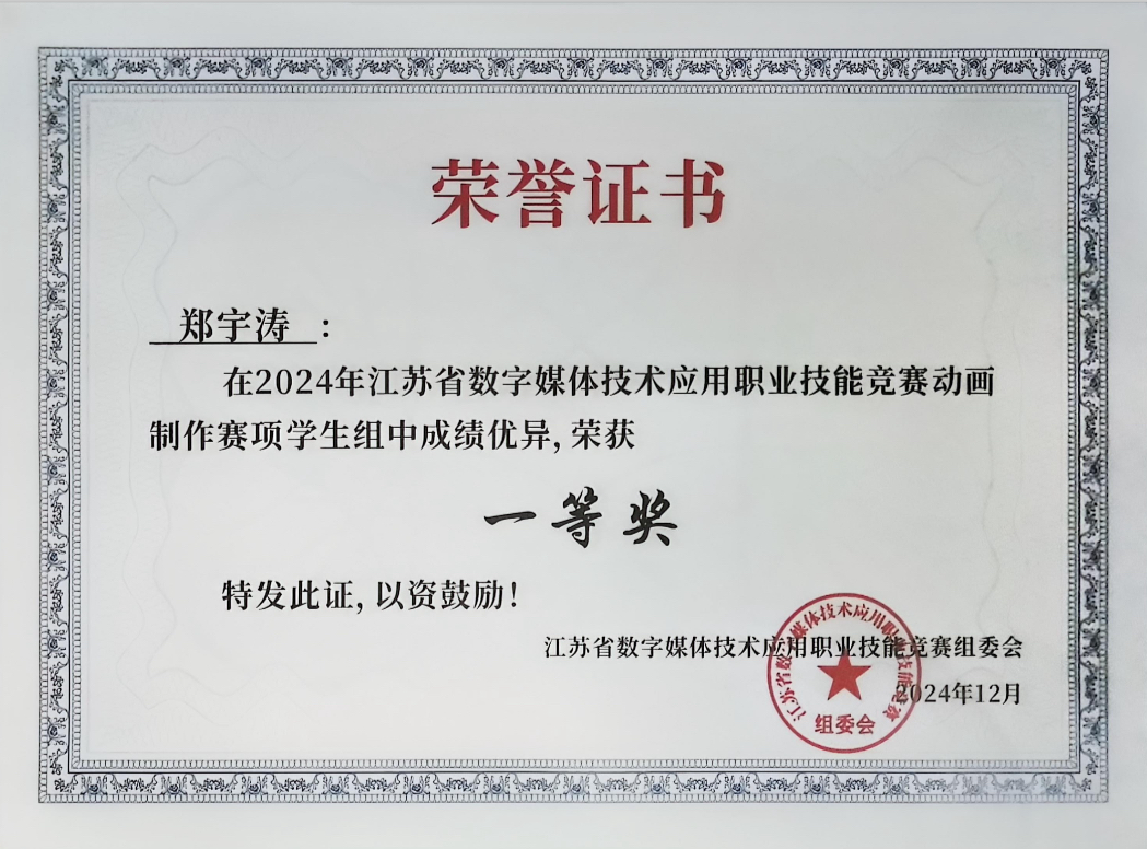 近日,江苏省数字媒体技术应用职业技能竞赛传来捷报,由我校数字文创学院王纯老师指导的2022级艺术设计专业郑宇涛同学在动画制作(学生组)比赛中喜获一等奖。