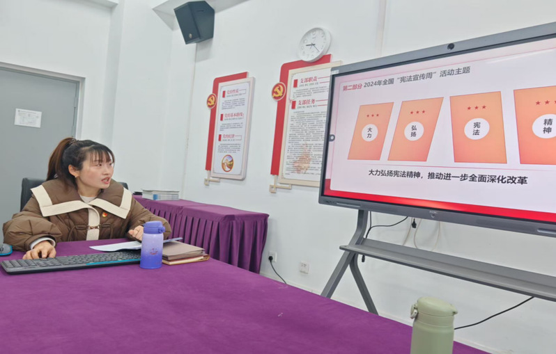 2024年12月4日是我国第十一个“国家宪法日”,为深入学习宣传贯彻习近平法治思想,彰显宪法权威,弘扬宪法精神,进一步增强全体党员的法治意识。随后,李欢欢同志围绕宪法的概念及其发展历程、宪法权威的来源、宪法的实施进行了详细阐述。她强调,宪法作为国家的根本大法,在国家治理、社会秩序维护和公民权益保障中占据着不可动摇的核心地位。她要求全体党员以此次活动为契机,积极发挥先锋模范作用,不仅自身要深入学习宪法、严格遵守宪法,还要带动身边的人共同参与到宪法的学习和实践中来,为全面依法治国贡献智慧和力量。