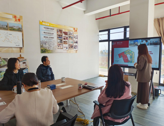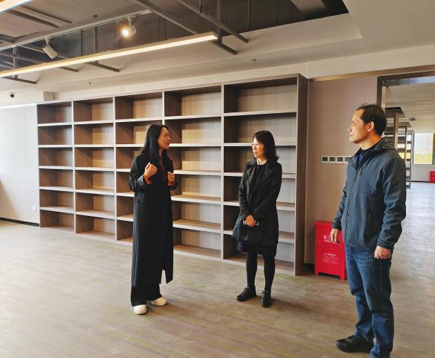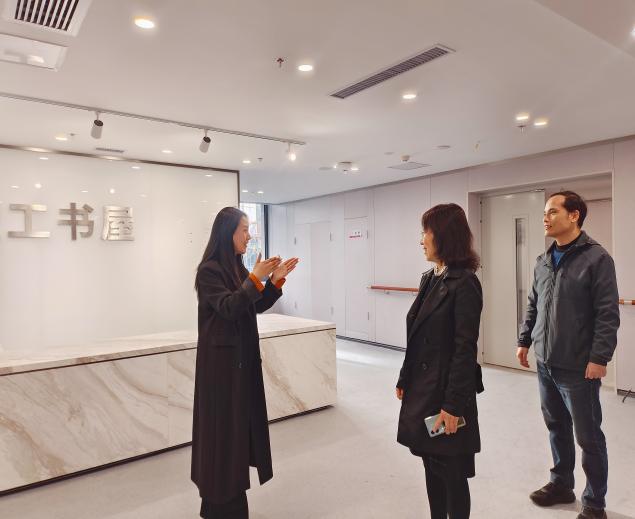 溧水经济开发区党工委副书记许金香,开发区党工委委员、二级调研员陈一鸣和文化宫同志对江校一行表示热烈欢迎,详细介绍了即将完工的文化宫在阅读、运动、美食、康养、剧场、直播电商、社会培训等各主要功能区域设计,提出了图书共建需求。江景副校长表示,学校将积极提供图书资源,支持文化宫职工书屋建设。同时,她结合文化宫各功能定位,介绍了学校相关专业资源、教师指导、学生实习就业等校地共建方面已取得的成果与今后合作设想。文化宫相关领导对我校近年来在深化产教融合、服务地方经济方面的成果给予了充分肯定,希望在今后工作中双方能发挥各自优势,更好开展一系列合作,并将合作第一步落实到职工书屋建设上。双方商议,我校图书馆发挥资源优势为职工书屋提供图书进行展示与阅览,并帮助完成职工书屋的布局、分类及后续工作开展。