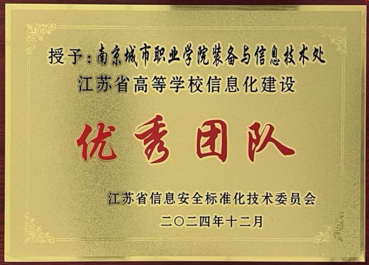 近日,江苏省高等学校教育信息化研究会网络信息管理专业委员会在南京召开“以数字化助力高等教育变革”研讨会暨学术年会。会上,对2024年度表现突出的优秀团队予以表彰,我校装备与信息技术处荣获“江苏省信息安全标准化技术委员会2024年网络信息管理优秀团队”称号。