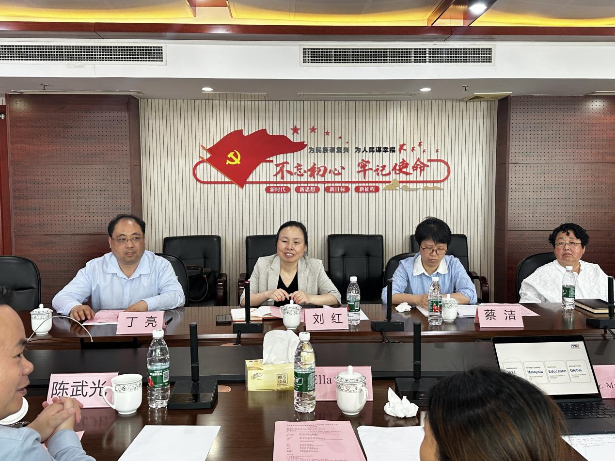 会议由丁亮副院长主持。刘红院长详细介绍了学院的情况及发展状况,提出中马联合培养人才的合作构想。国际教育学院蔡洁副院长随后介绍了自2019年以来学校留学生招生与教学成果。