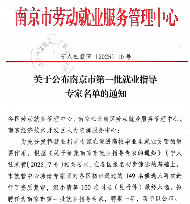 近日,南京市劳动就业服务管理中心公布《南京市第一批就业指导专家名单》(宁人社就管〔202510号),我校李莉、邓莹、周宇寰三位教师成功入选。
