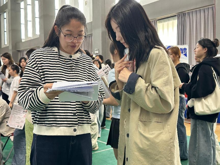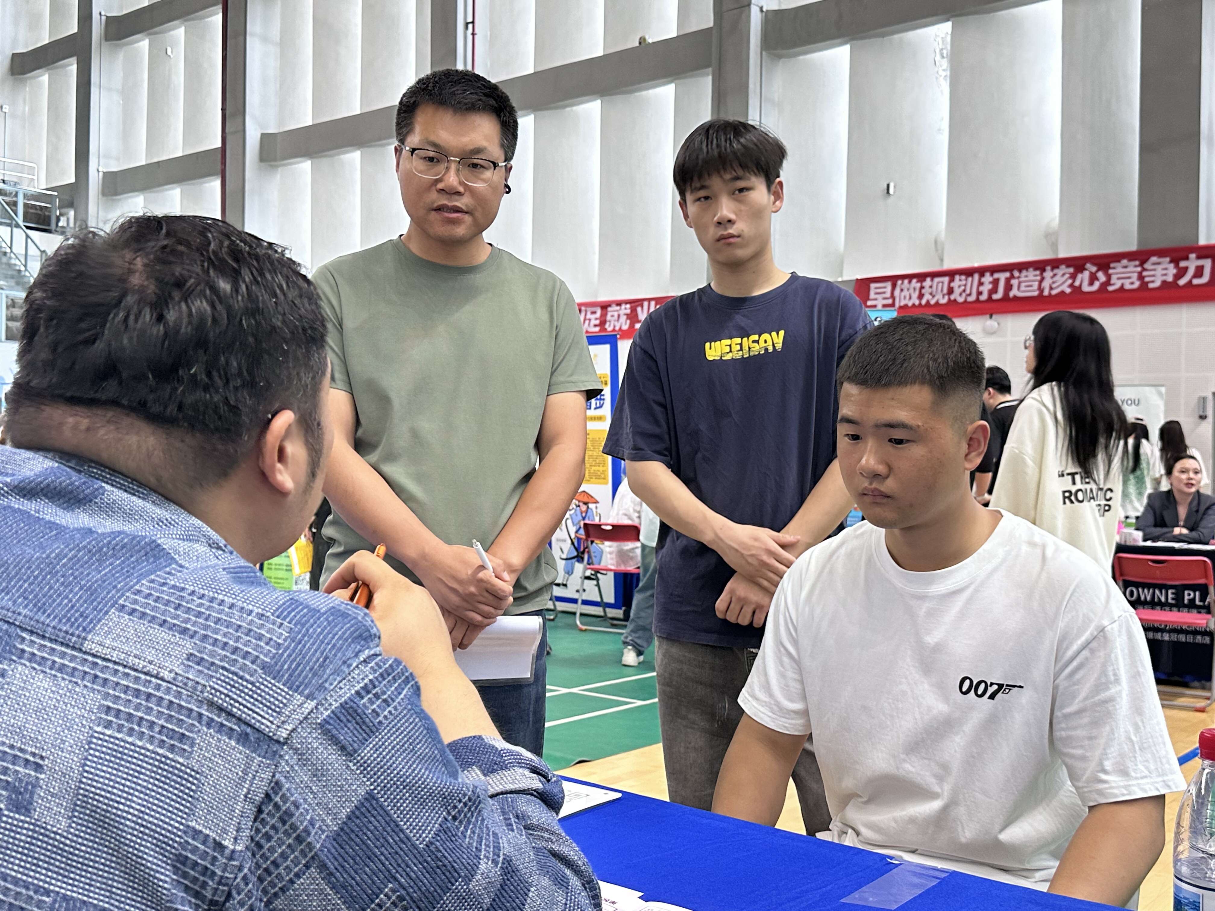 双选会现场辅导员化身“求职导师”,为学生提供一对一指导。“你的实习经历描述不够具体,建议用‘数据+成果’的方式呈现。”“面试时要注意眼神交流和肢体语言,展现自信从容的状态。”在现场,辅导员们结合学生专业特点和求职意向,从简历排版、内容优化到面试技巧、职业规划,进行全流程细致指导,个性化就业服务,帮助学生解决“简历关”“面试关”等实际问题。