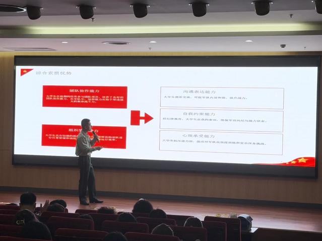 宣讲会上,徐烨结合自己在部队的服役经历,用生动的语言和真实的故事,讲述了从一名普通大学生到合格军人的蜕变过程。他分享了在艰苦训练中磨砺意志、在团队协作中收获成长、在执行任务中担当责任的点点滴滴,让同学们深刻感受到了军旅生活的热血与荣耀。在入伍政策解读环节,徐烨同学从应征报名条件、入伍流程、优待政策、职业发展等多个方面进行了详细讲解。他特别强调了国家对大学生参军入伍的重视和支持,鼓励同学们抓住机遇,在军队大舞台上实现人生价值。
