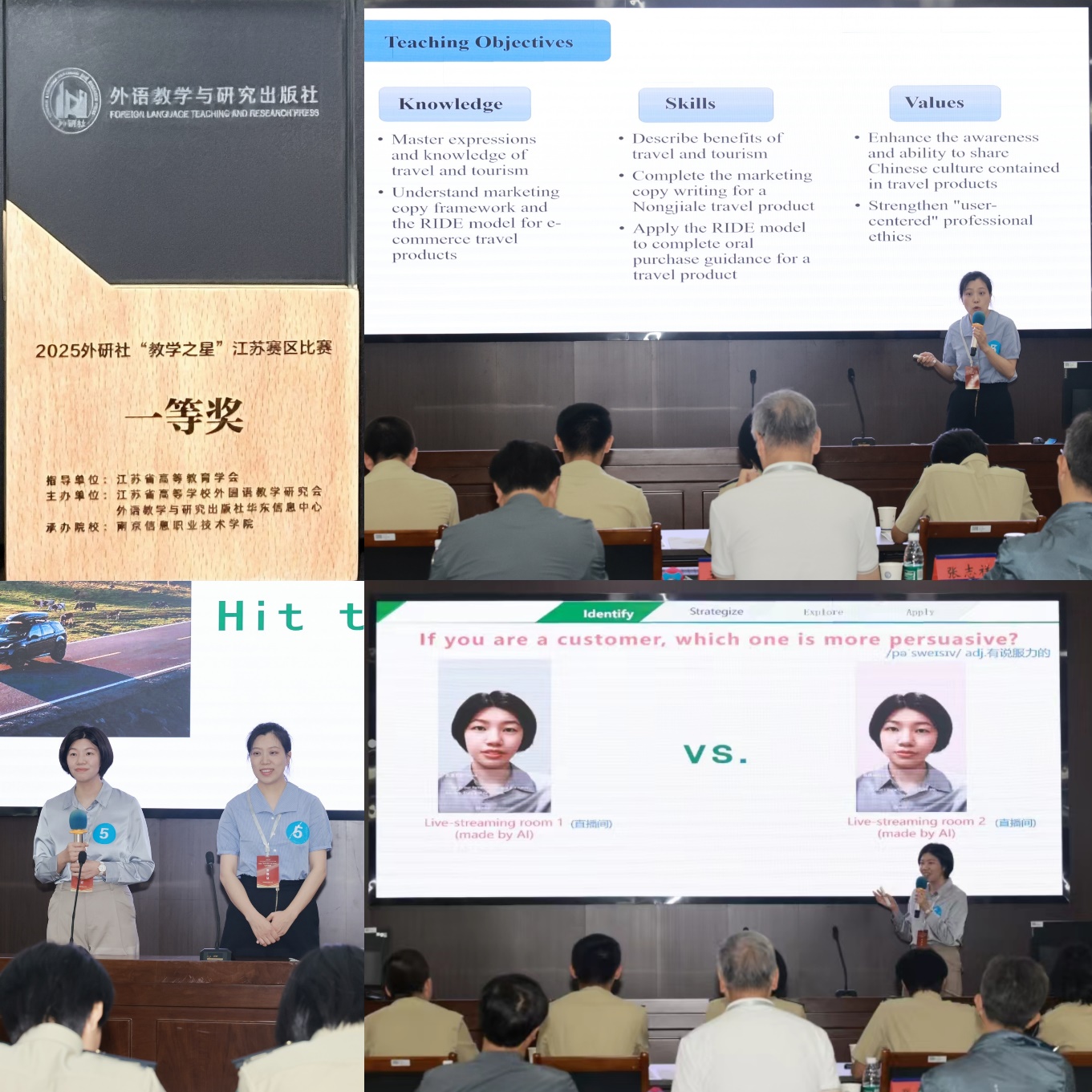 6月21日至22日,2025外研社全国高校外语教师“教学之星”大赛江苏赛区比赛在南京信息职业技术学院举行。我校公共教学部潘敏、支婷婷、赵羽涵、沈玲教师团队代表我校首次参赛,荣获高职组一等奖(最高等次奖项)第二名,成功晋级全国半决赛。