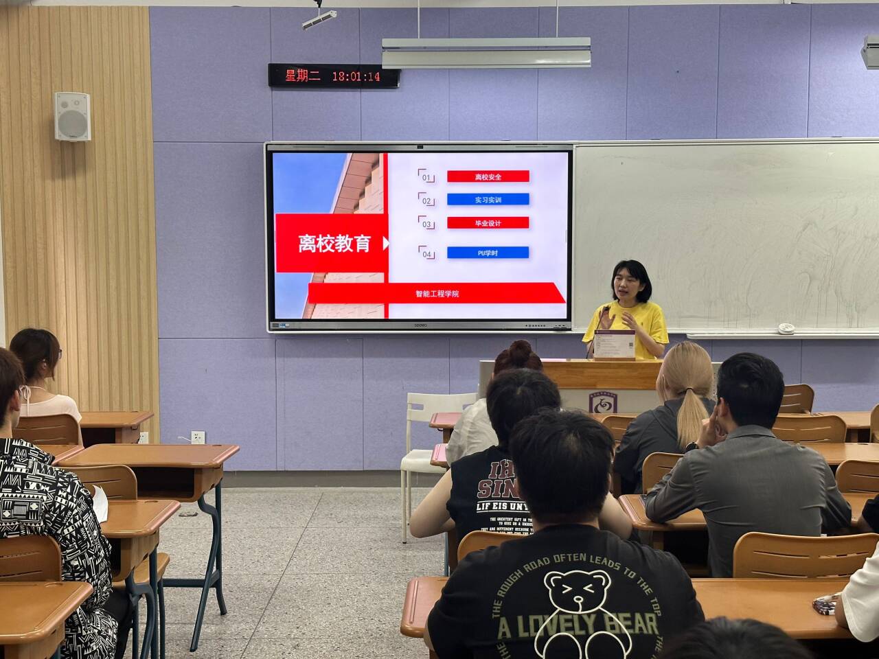 为切实保障学生实习期间的人身财产安全,强化学生安全责任意识,助力学生顺利开启实习生涯,近日,智能工程学院精心组织各班级开展实习离校安全教育主题班会,为即将踏上实习岗位的学生上好“安全第一课”。