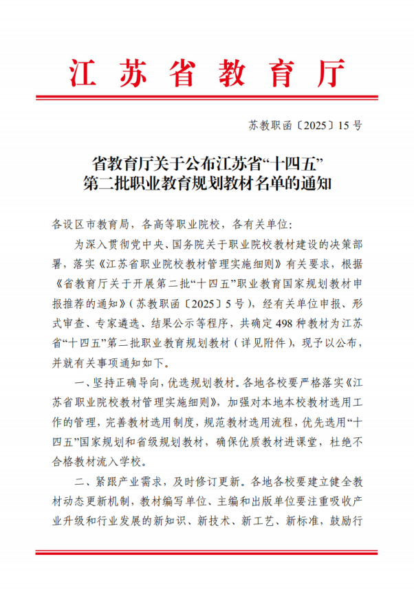 近日,江苏省教育厅下发《省教育厅关于公布江苏省“十四五”第二批职业教育规划教材名单的通知》(苏教职函〔202515号),我校《数字技术与数据可视化》《BIM应用基础教程》《老年人康复保健技术》3部高职教材成功入选。